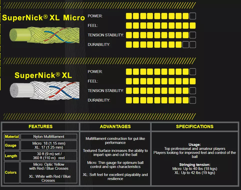 Advantages of the SuperNick XL include: Multifilament construction for gut-like performance. Textured surface increases the ability to impart spin and cut the ball. Soft feel for excellent playability and resilience.