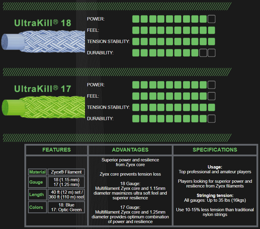 The UltraKill family of racquetball strings features a multifilament Zyex core encapsulated with a high tenacity monofilament nylon wear surface.